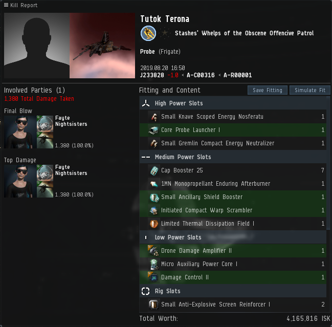 I tackled the Probe but the Magnate had drifted out of range. No matter, he was probably refit with stabs anyway. The Probe scrammed me and commenced neuting – fit as predicted. He made a good account of himself but he was never going to be a match for the Astero and was duly wrecked and podded.